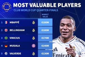 体育资讯7月3日讯 世俱杯八强已经决出,《转会市场》也统计了当前的球员身价情况,前五名中有4名皇马球员。